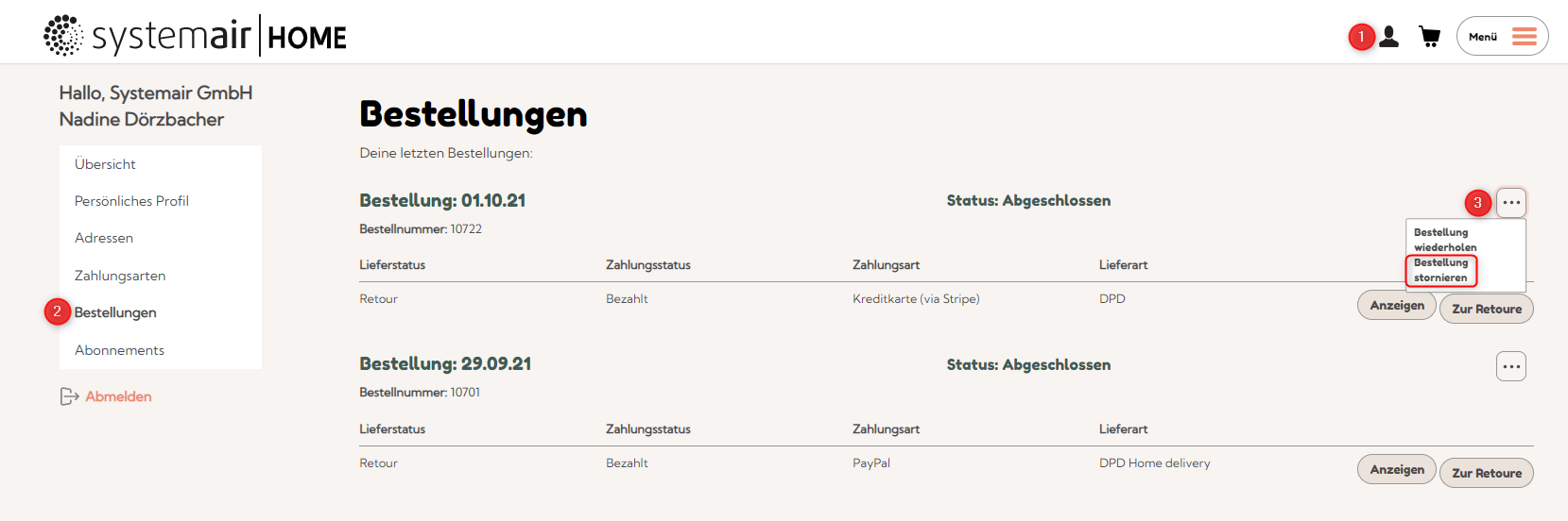 To cancel your orders, log in to your customer area with your user data and click on the "Orders" button. The three dots behind your order will take you to the "Cancel order" button. You must then confirm your entry in the next window.