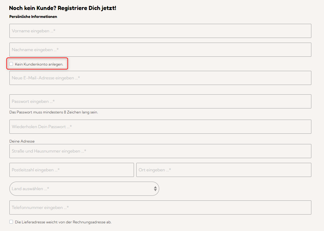By ticking the box "Do not create a customer account" during the ordering process, you can complete an order without registering.