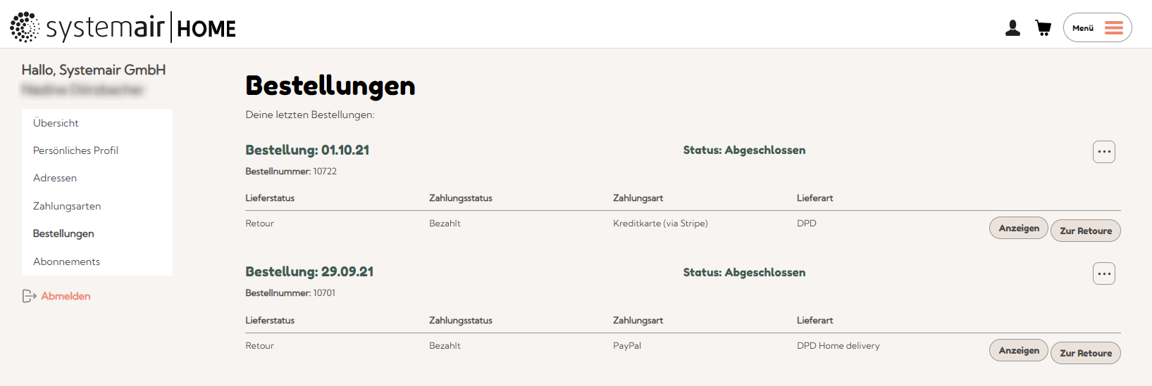To create a return, log in to your customer area with your user data and select "Orders". Here you can create a return for the individual orders using the "To return" button.